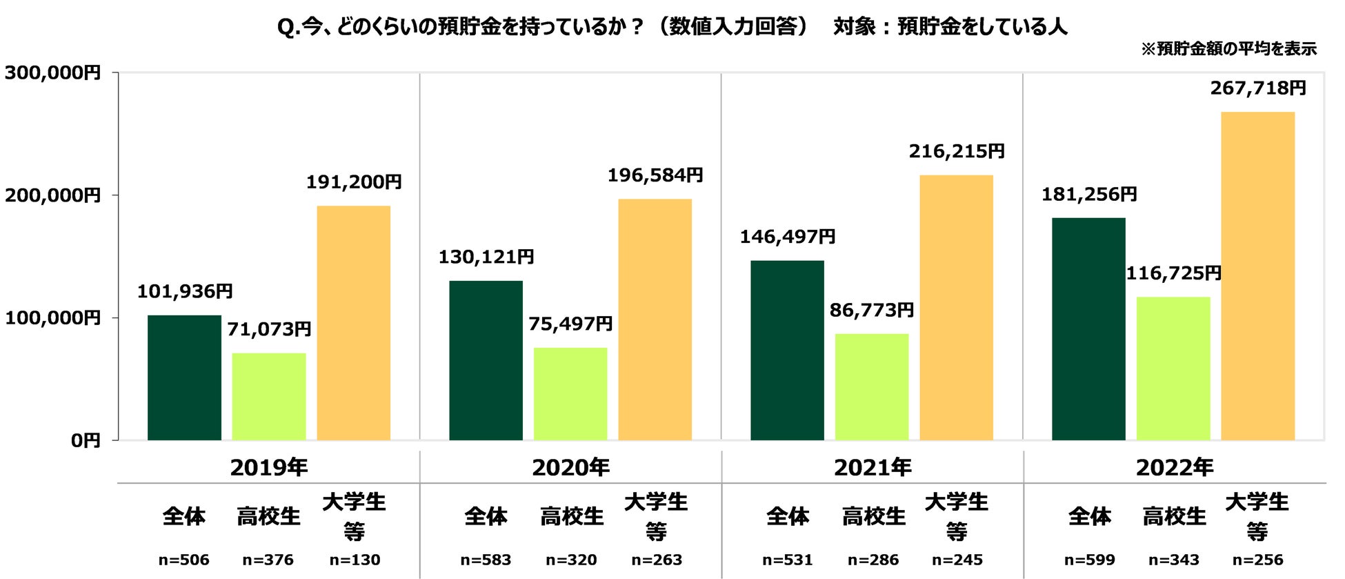 10代の預貯金額の平均について過去の調査結果と比較した結果、全体では79,320円の増加(2019年調査101,936円→2022年調査181,256円)、高校生では45,652円の増加(2019年調査71,073円→2022年調査116,725円)、大学生等では76,518円の増加(2019年調査191,200円→2022年調査267,718円)と、大幅に増加しています。