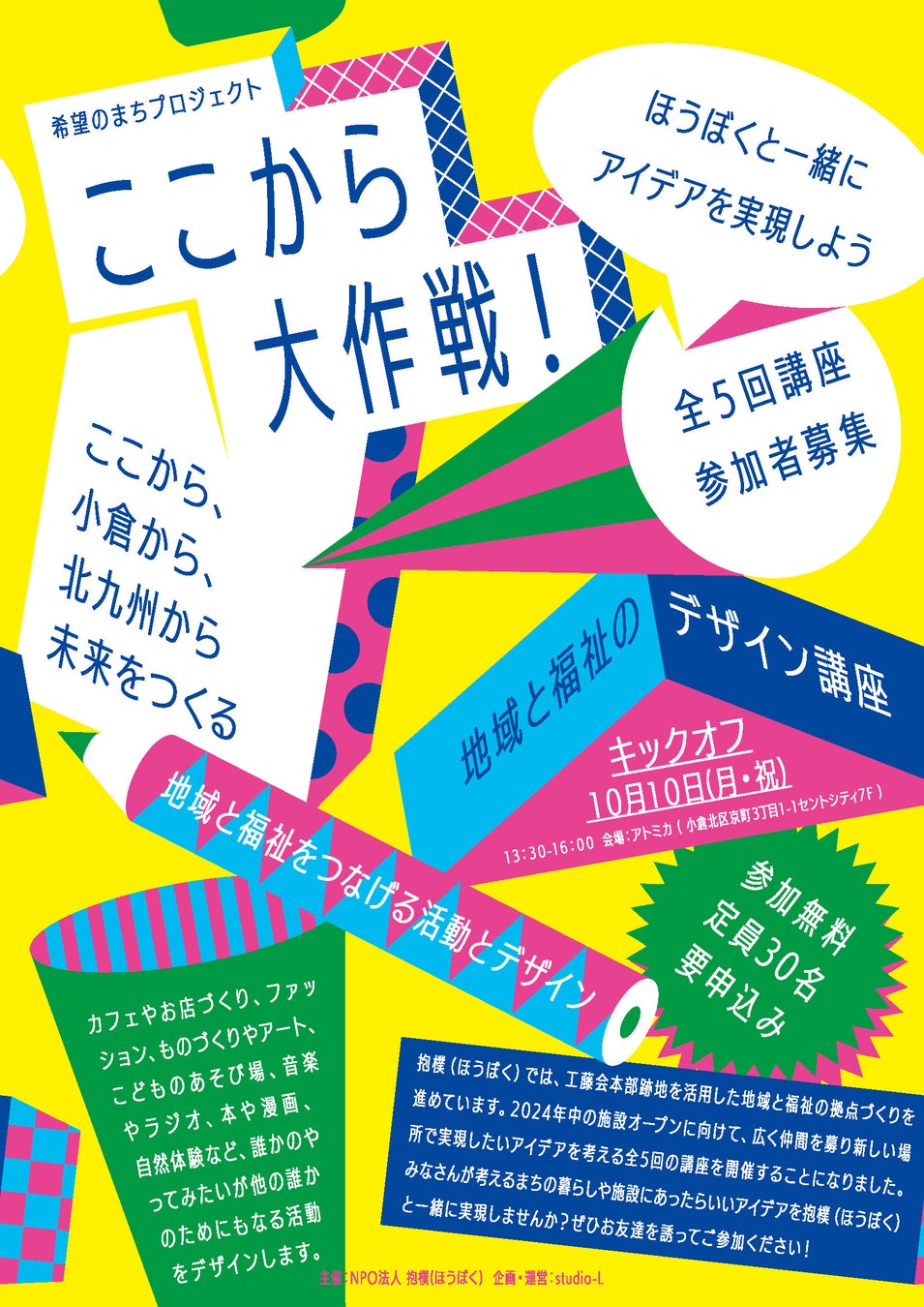 講座は、コミュニティデザイナーの山崎亮さんのstudio-Lと運営します。デザインの視点を取り入れながら、みなさんと一緒にどんなことが始められるのか?ここから、小倉から、北九州から全国に向けて発信します!