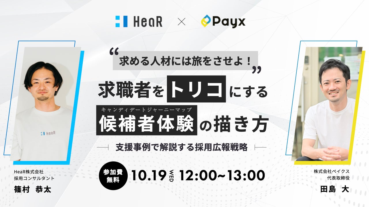 そんな採用担当の皆様のお悩みを解決すべく、 本セミナーでは、数々の採用コンサルティング・企業ブランディング支援を手掛けたHeaR株式会社コンサルタント篠村氏と当社CEO田島が、支援事例を用いながら「認知」から「入社」までの各フェーズごとに効果的な実践方法・考え方を解説いたします。