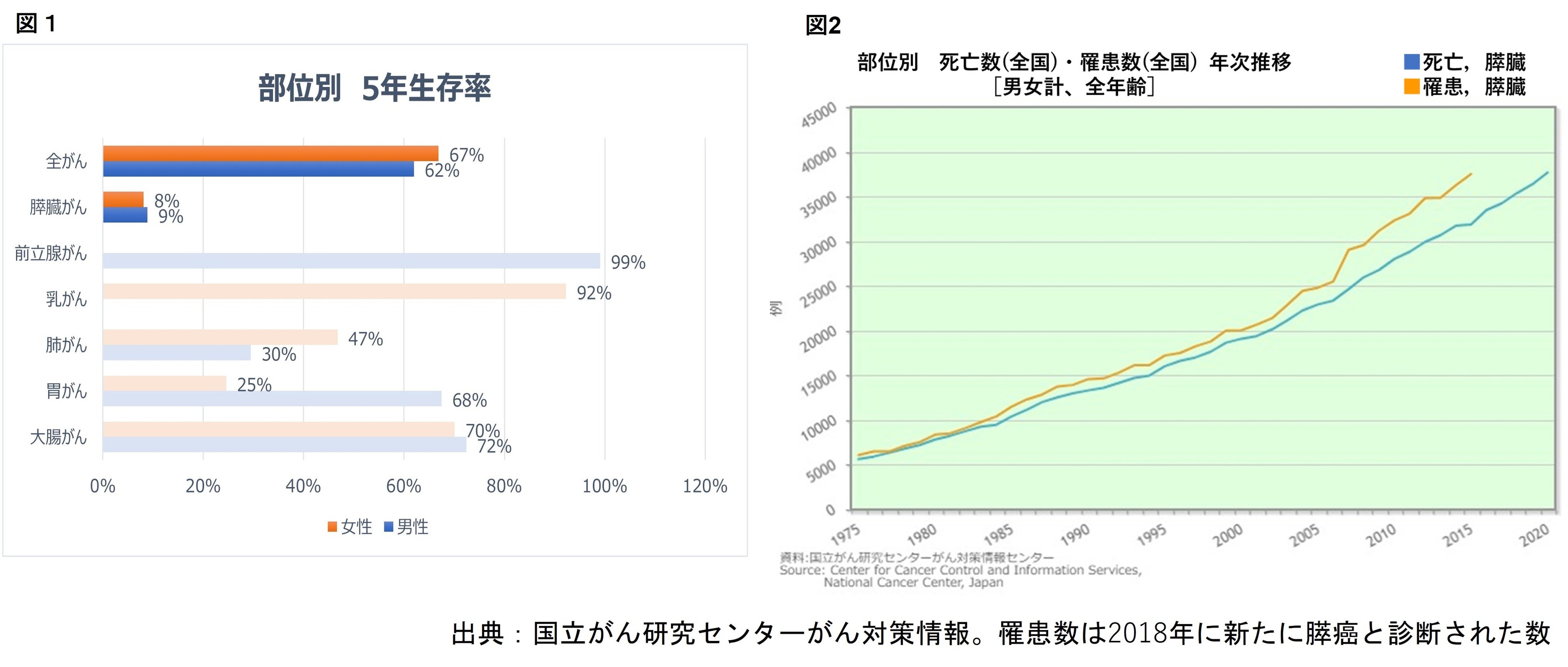 膵癌は最も予後不良の癌の一つで、全体の5年生存率は8.5%と報告されています(図1)。がん統計では膵癌による死亡数は女性で3位、男性で4位、年罹患数は42,361人、今後も更なる増加が予測されています(図2)。さらに、膵癌のリスク因子とされる膵嚢胞性疾患も増加しており、精査対象となる患者が増えています。