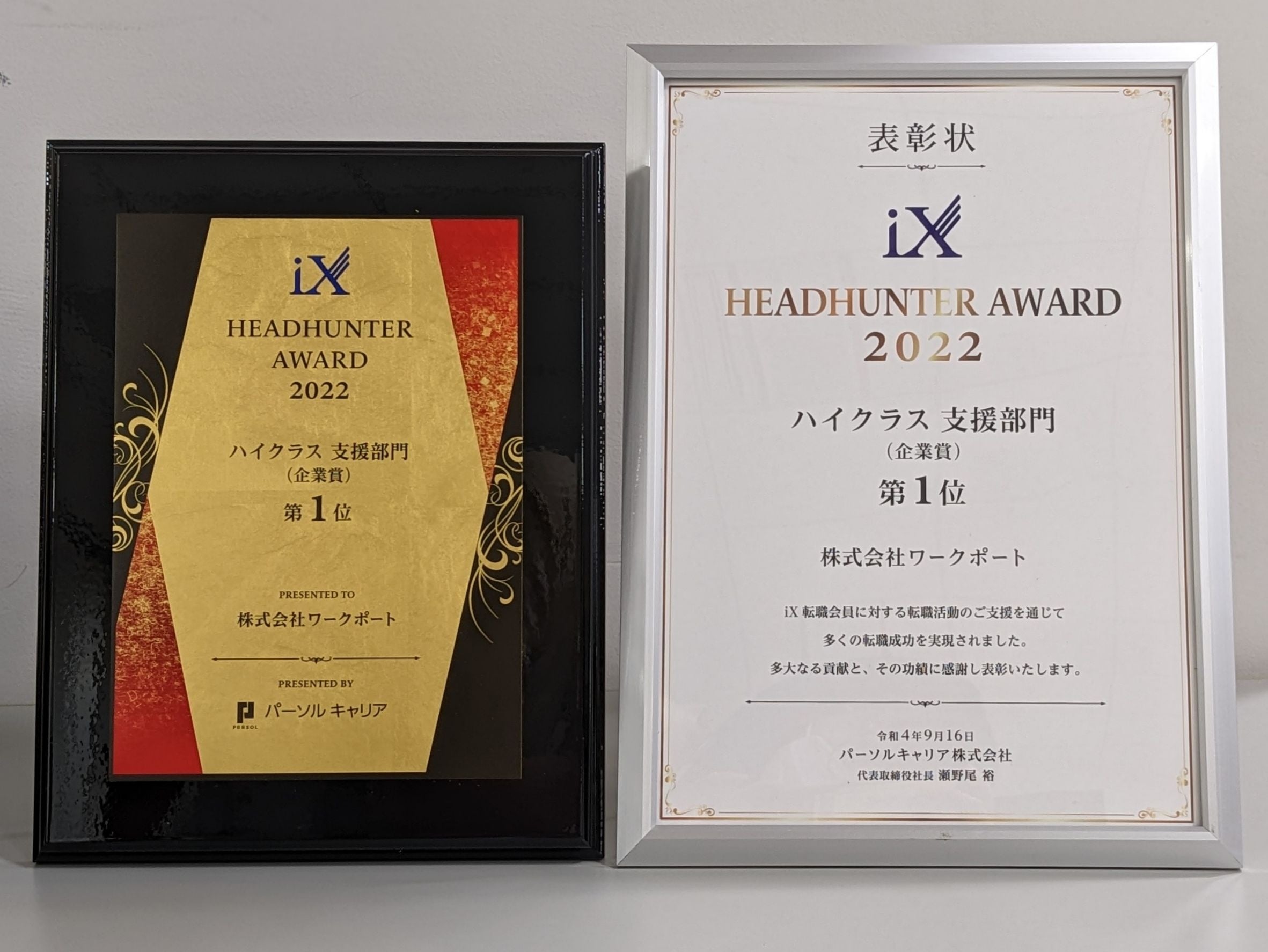 この度パーソルキャリア株式会社が主催する「iX HEADHUNTER AWARD 2022」にて、『ハイクラス 支援部門1位』(法人賞)を受賞いたしましたことをお知らせします。