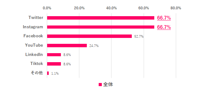 Q.4で「社員のSNSを見る」「社長のSNSを見る」と答えた人に、どのSNSを見るか尋ねてみると、「Twitter」と「Instagram」が同率1位で66.7%、3位が「Facebook」52.7%でした。