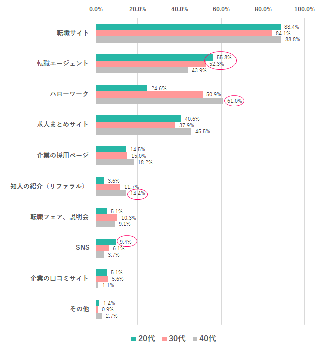 年代別に見てみると、20代・30代の「転職エージェント」の利用率が高く、40代は「ハローワーク」が61.0%と高い結果となりました。また、「知人の紹介(リファラル)」は年代が上がるごとに利用する人が多くなり、逆に「SNS」は若い年代ほど利用していることがわかりました。