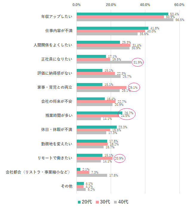 年代別では、トップ2は全体と同じものの、「柔軟な働き方(リモートワーク、時短など)」が30代で3位と他の年代より高くなっており、ここでも子育て中の人が多いことによる影響が推察されます。