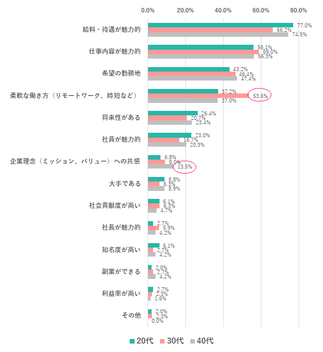 また、「企業理念(ミッション、バリュー)への共感」は年代が上がるごとに回答率が高く、ミドル世代に近づくほど自身と企業との価値観の一致を求める人が多くなる傾向が見て取れます。