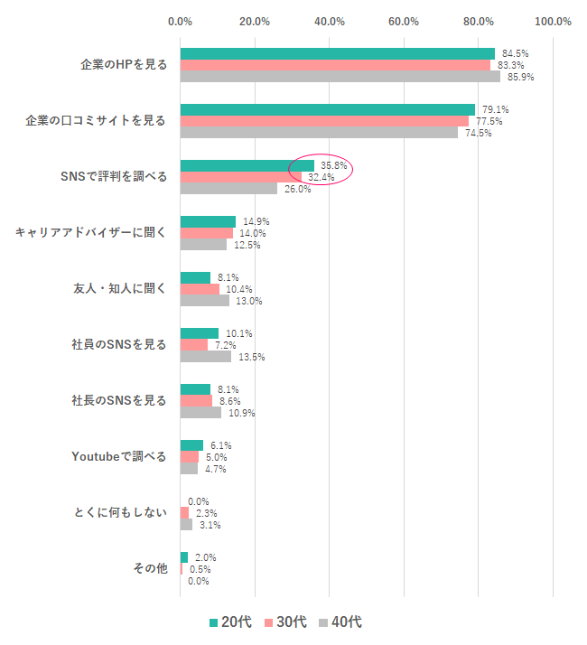 年代別で見ても結果に大差はありませんでしたが、「キャリアアドバイザーに相談する」「SNSで調べる」「Youtubeで調べる」は若い年代ほど高い回答率となっており、20代と40代で比較すると、「SNSで調べる」「Youtubeで調べる」は約2倍の差があることがわかりました。