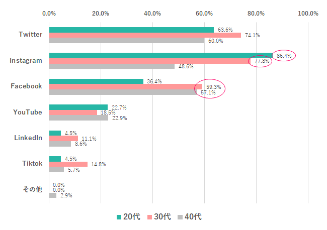 年代別では、20代・30代は「Instagram」、40代は「Twitter」が1位でした。30代・40代については「Facebook」も約6割と多く、20代の36.4%とは大きな差がつきました。20代があまり「Facebook」を活用していない実態が見て取れます。