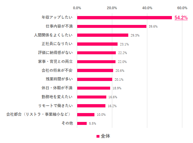 転職したい!と思った理由について尋ねると、1位「年収アップしたい」54.2%、2位「仕事内容が不満」39.6%、3位「人間関係をよくしたい」29.3%でした。