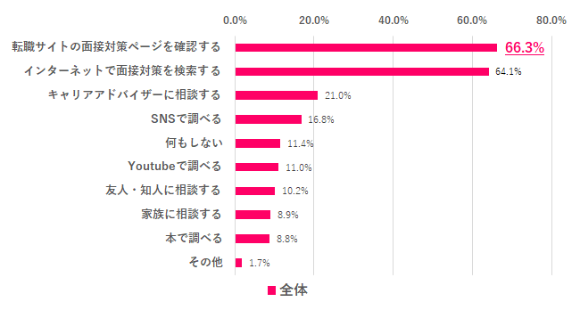 面接対策については、1位「転職サイトの面接対策ページを確認する」66.3%、2位「インターネットで面接対策を検索する」64.1%となっており、6割以上の人が行っていることがわかりました。