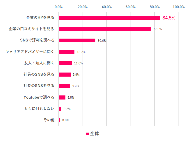 求人情報を見る以外に行う情報収集としては、1位「企業のHPを見る」84.5%、2位「企業の口コミサイトを見る」77.0%となっており、この2つは大多数の人が行っていることがわかりました。