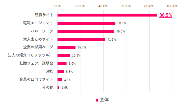 『女の転職type』会員にどんなサービスを使って転職活動をしているか(したことがあるか)を聞いたところ、1位「転職サイト」86.5%、2位「転職エージェント」50.4%、3位「ハローワーク」49.3%となりました。