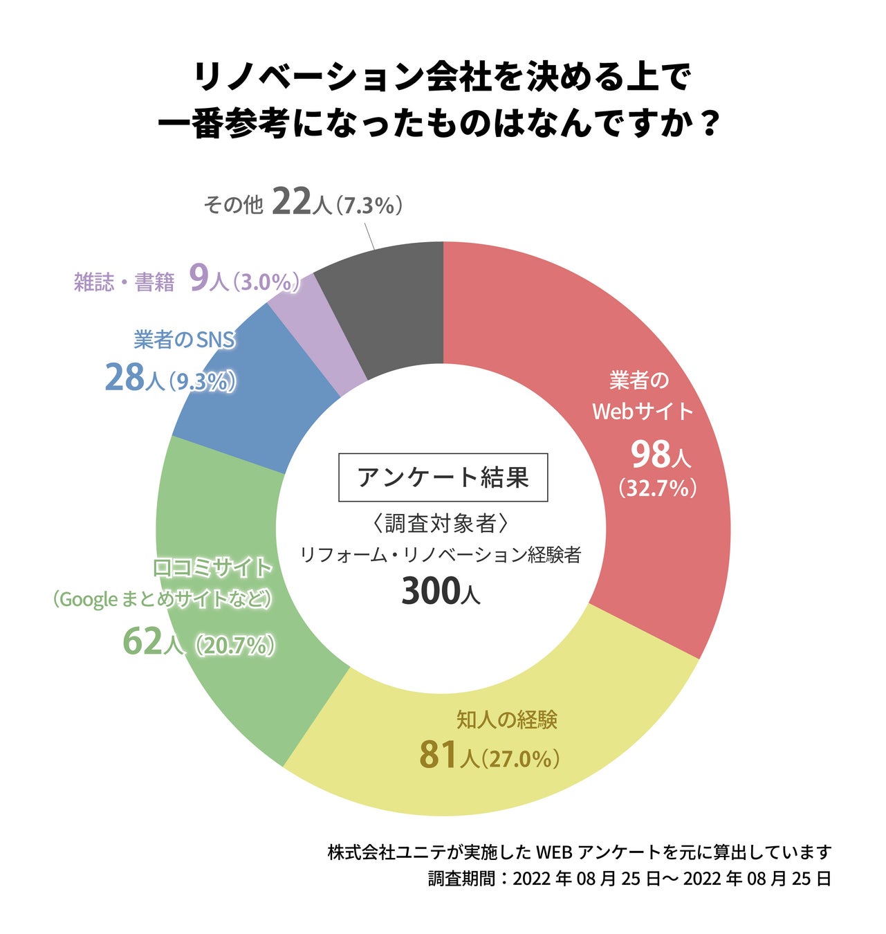 また、業者を決める際の情報源として最も票を集めたのは「業者のWebサイト」で、ついで「知人の経験」がランクインする結果となりました。