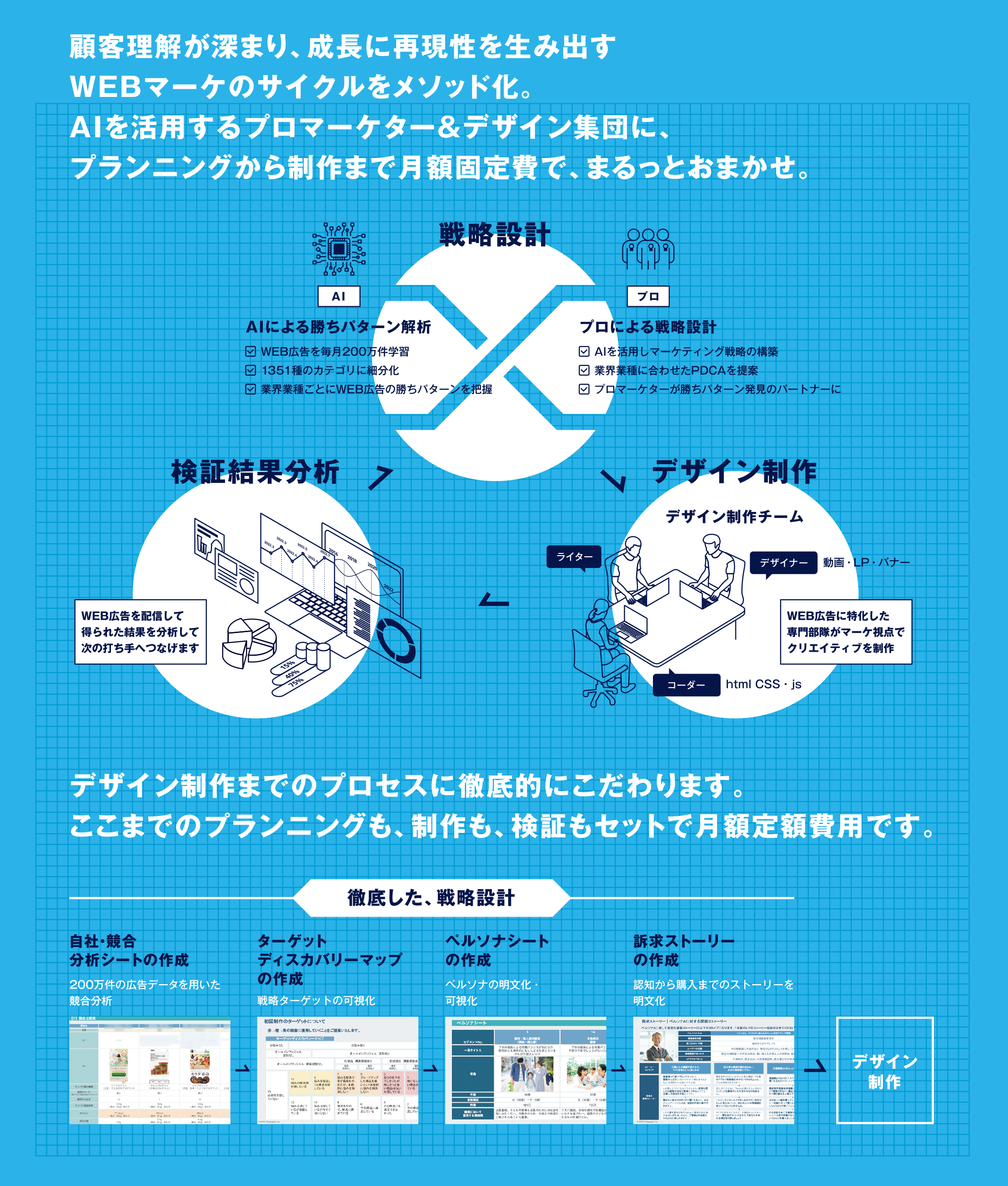 「AIR Design」は、Webマーケティングに必要なノウハウや仮説検証のプロセスを一気通貫で提供するサービスです。Webマーケティングにおけるクリエイティブ(ランディングページ・バナー・動画広告)の制作だけでなく、仮説設計からクリエイティブによる検証、施策の振り返りから新たな仮説設計までの一連のサイクルを繰り返すことで、短期間での大幅な成果改善・売上向上を実現します。