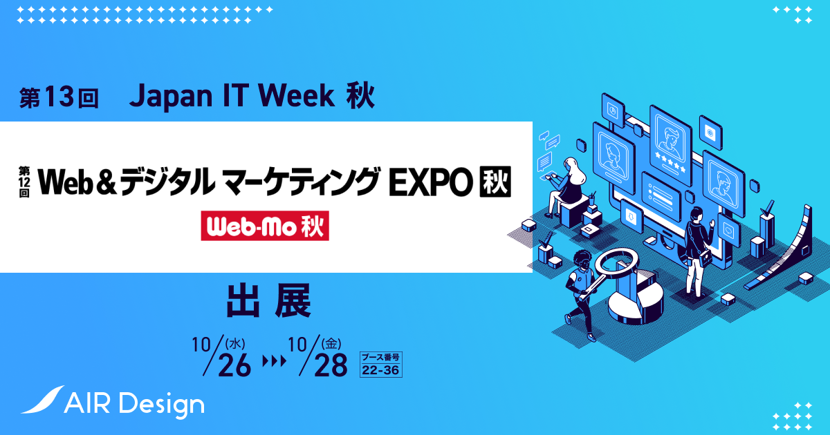 当社は「第12回 Web&デジタルマーケティング EXPO 秋」にブースを出展し、「AIR Design」の紹介とともに、マーケター必聴の特別セミナーやマーケティング上のお悩み相談会等を開催いたします。
