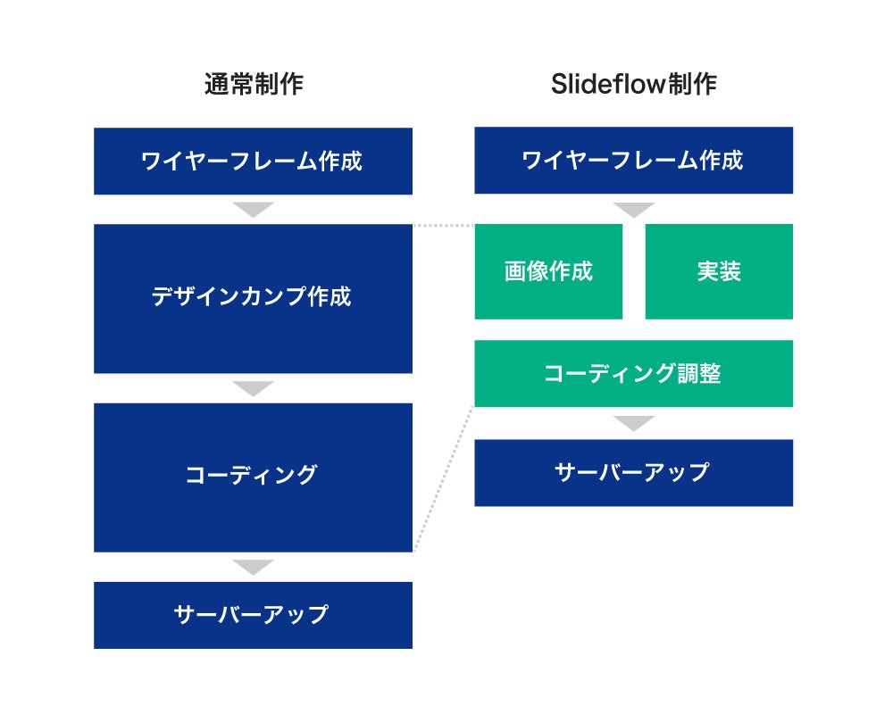 Slideflowは、パワーポイントで制作したデザインをWebサイトに変換するツールです。パワーポイントで制作するとはいえ、UI/UXを加味した作りを実現するためにデザイナーとコーダーの稼働はある程度必要になりますが、Slideflowの活用によりその稼働は大きく削減されます。