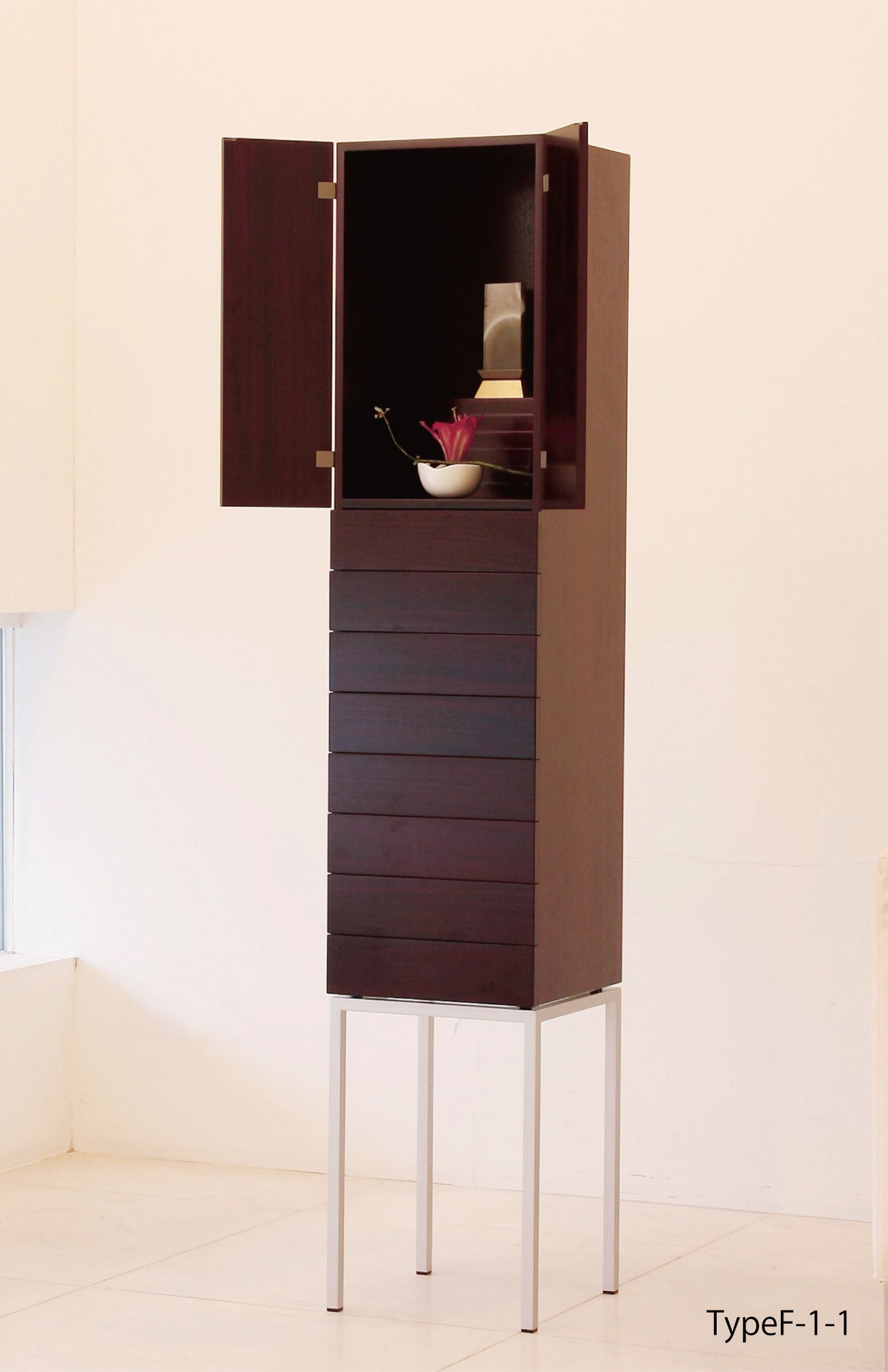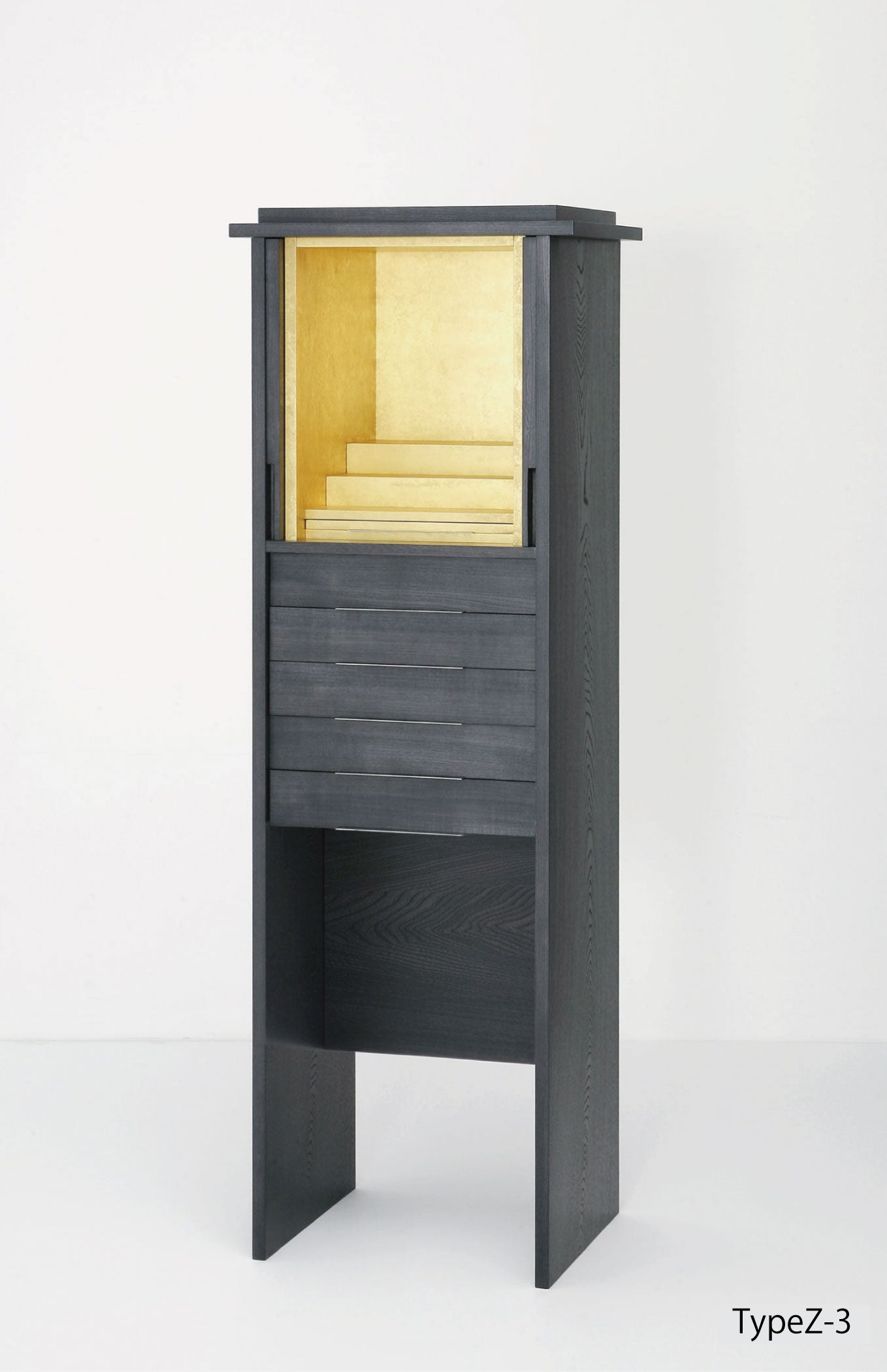 内田繁氏の手掛けた「デザイン厨子」シリーズは、『水平と垂直』で構成され、客観的で普遍的なデザインとなっています。「現代の仏壇はその時代の建築に同化したものである」との考えから、現代の暮らしや生活空間に合ったサイズやデザインの必要性を唱え、厨子シリーズに落とし込みました。卓上に凛と佇むTypeAはその代表的なデザイン厨子のひとつです。