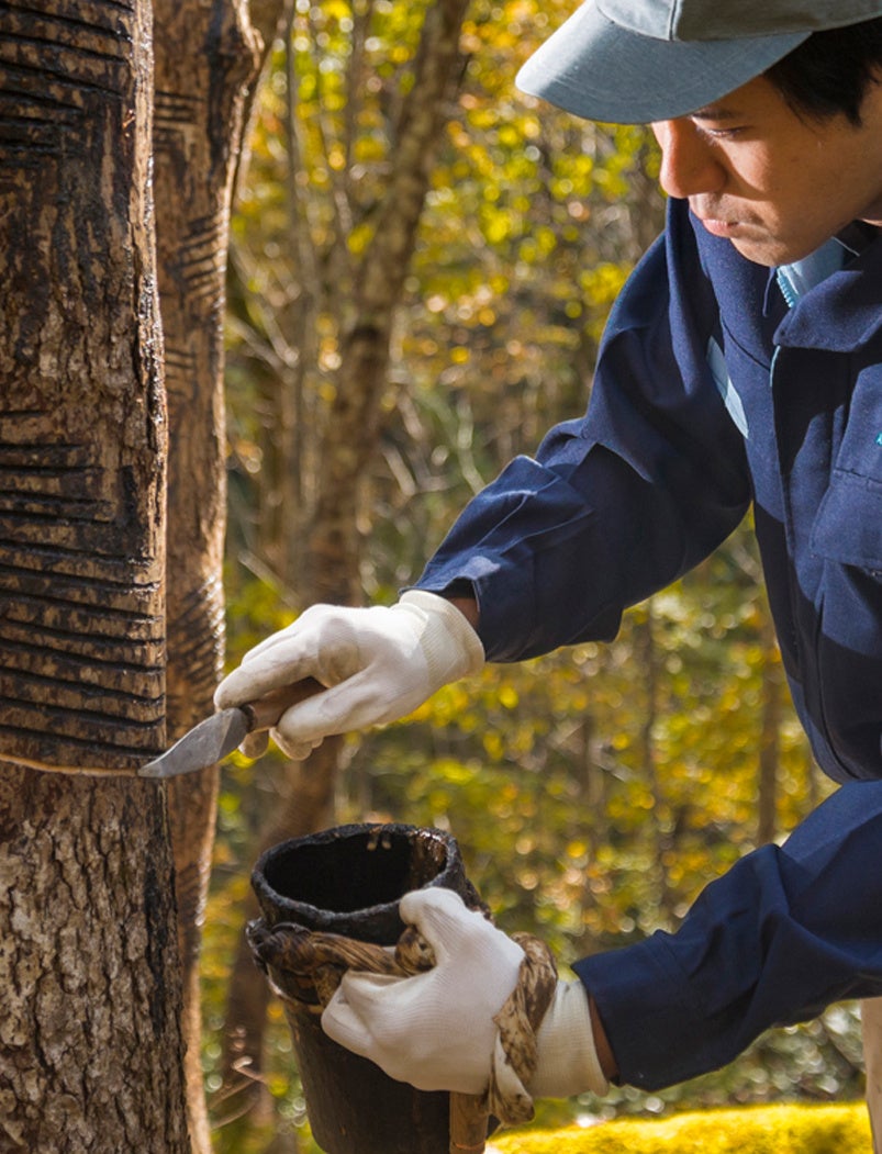 一方、「TypeA 欅_漆」は欅材の持つ力強く美しい柾目を使用し、拭き漆の技法で仕上げました。生漆を<塗る><拭き取る>の工程を繰り返すことで木材の持つ本来の濃淡を浮き立たせます。この生漆は、当社が半世紀前より取り組んできた漆栽培活動から生まれたものです。