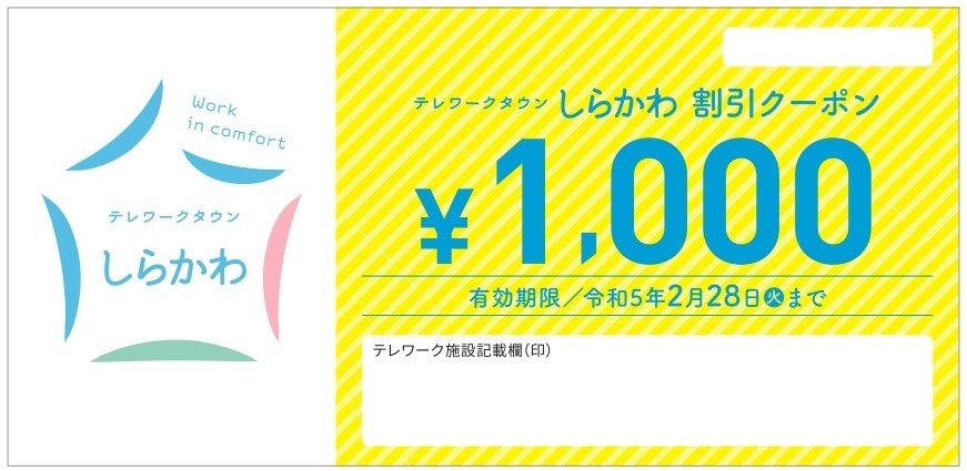以下のコワーキングスペースにて、テレワークをした方で、アンケートにご協力いただいた方に、テレワークタウンしらかわ参加飲食店(別紙一覧16 店舗)で使用できる1,000 円分の割引クーポンを贈呈(配布は1人につき期間中2枚まで)します。