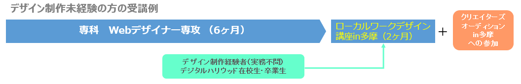 Webデザイン、グラフィックデザイン等の制作未経験者の方には、デジタルハリウッドSTUDIOの最人気講座「専科Webデザイナー専攻」6ヶ月のコースに『ローカルワークデザイン講座in多摩』の2か月がセットになった『Webデザイナー専攻 多摩パック』の受講がおススメです。
