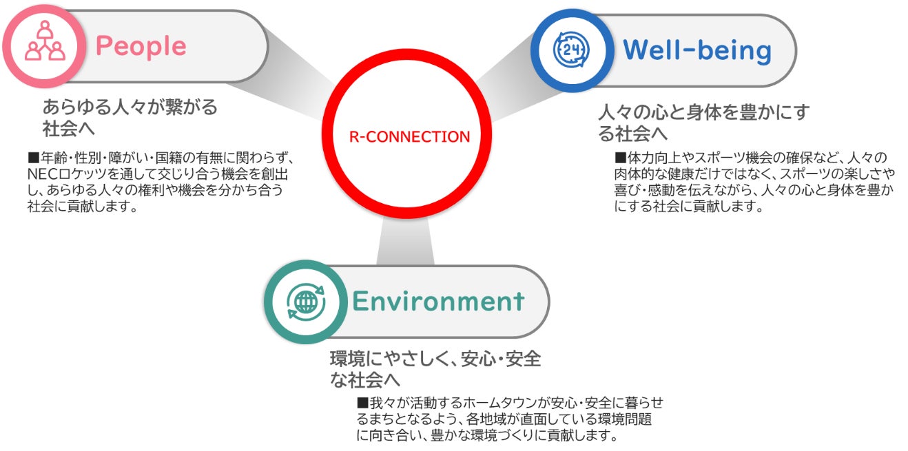 あらゆる人々一人ひとりが輝く社会となるために、NECロケッツが人やコミュニティー、そして社会をつなぐ“懸け橋” (CONNECTION)となる!「R-CONNECTION」には、このような想いが込められております。自分たちの出来ることから積極的に取り組み、そして、私たちだけではなく、応援してくださるファンの皆さまやサポートしていただくパートナー企業様、自治体、地域の皆さまのご協力を得ながら、共に取り組んでまいります。