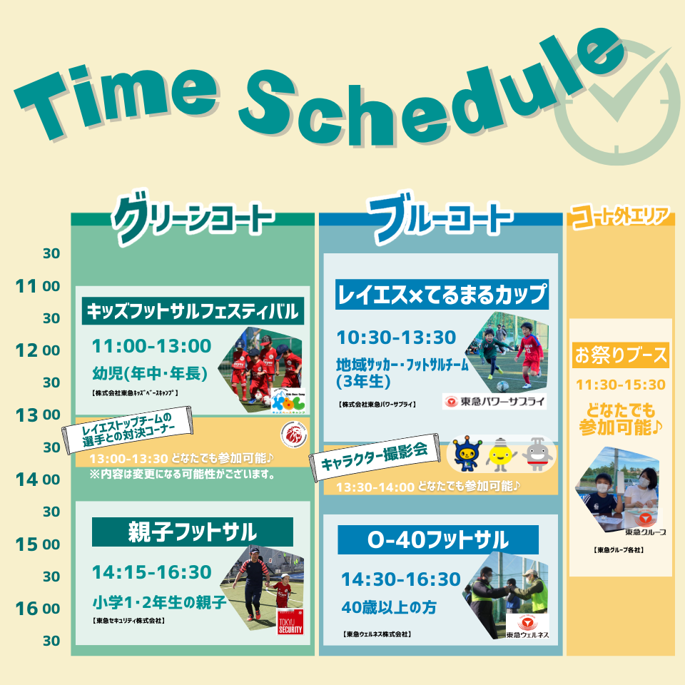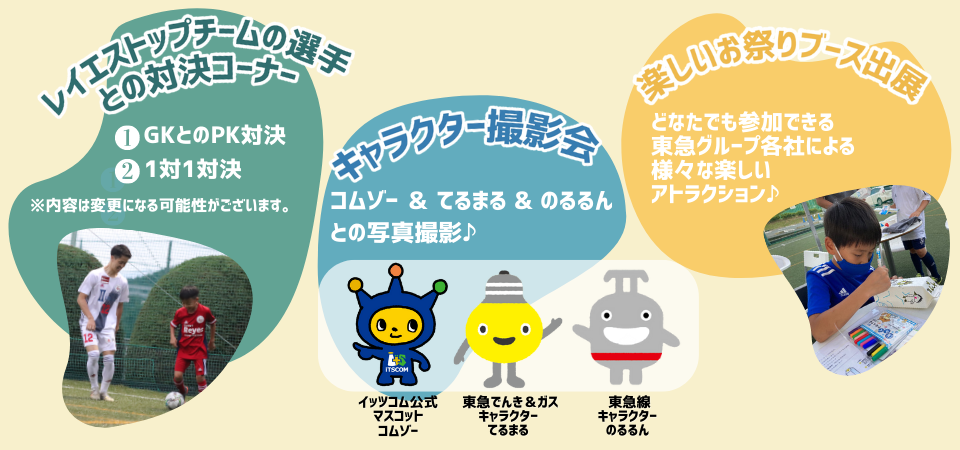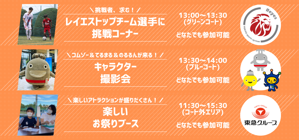 どなたでも参加できるコムゾー&てるまる&のるるんとの『キャラクター撮影会』、東急SレイエスFCのトップチームの選手とPK対決や1対1対決などの『レイエストップチームの選手との対決コーナー』、東急グループ各社による様々な楽しいアトラクションを出店する『楽しいお祭りブース』を開催いたします。
