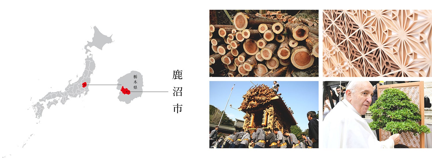 「鹿沼の木の間」から「KINOMA(キノマ)」と名づけ、今の鹿沼の成り立ちとなる一連の歴史の積み重ねを、木の年輪に見立てKINOMAのアルファベットで表現