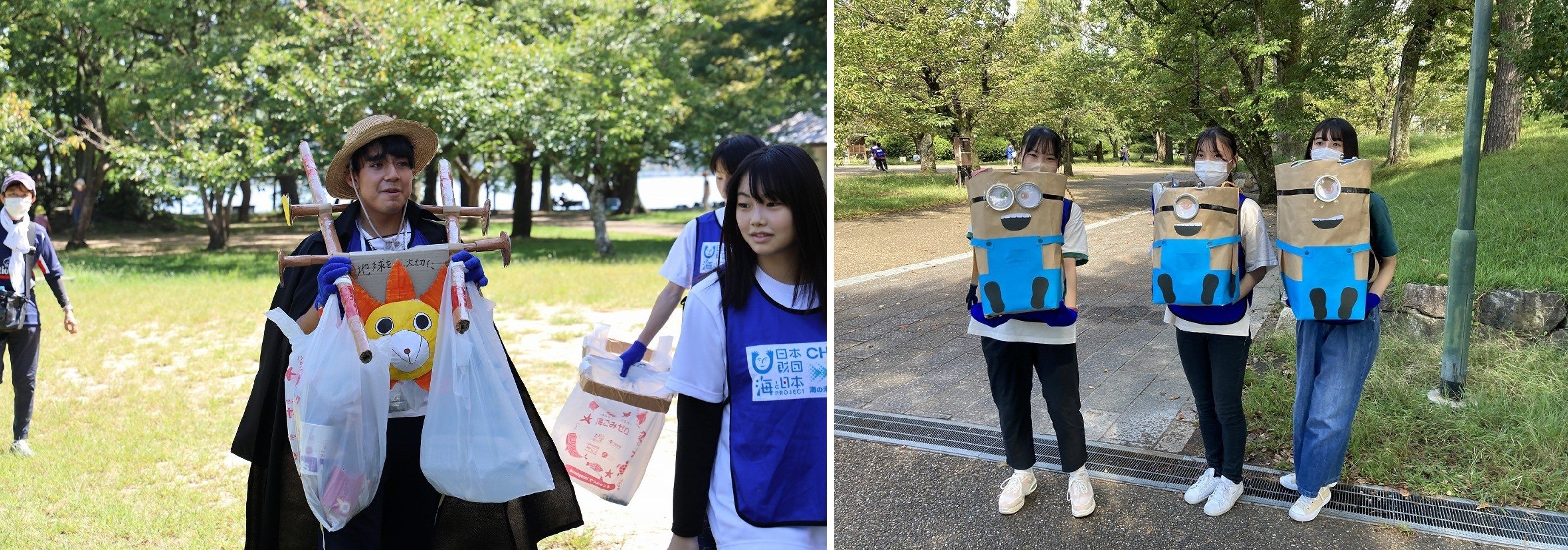 滋賀県大会では全チームがごみ拾いのオリジナルアイテムを持参しました。海洋ごみ削減に向けたメッセージが書かれた背負えるかごや、米袋を再利用して作られたキャラクターをあしらった袋など、個性的な作品が持ち込まれました。オリジナルアイテム賞には、コスプレで会場を盛り上げてくれたディエゴ海賊団が持参した、複数のごみ袋を掛けることができる背負子が選ばれました。
