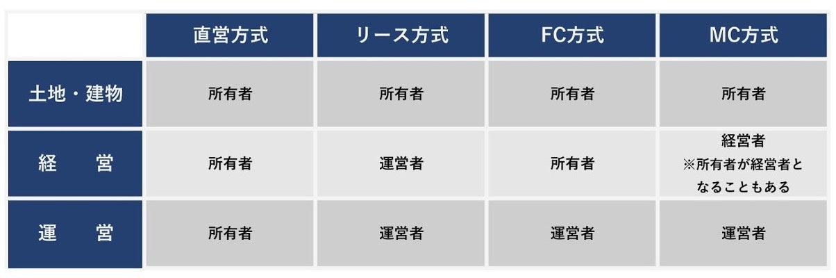「所有」「経営」「運営」の3つの事業に、それぞれ別の企業が携わる方式です。ただし、「所有」と「経営」を同一企業が受け持つケースもあります。ホテルを所有するオーナーが、運営のノウハウを持つ専門会社に委託料を支払い、日々の運営を任せます。