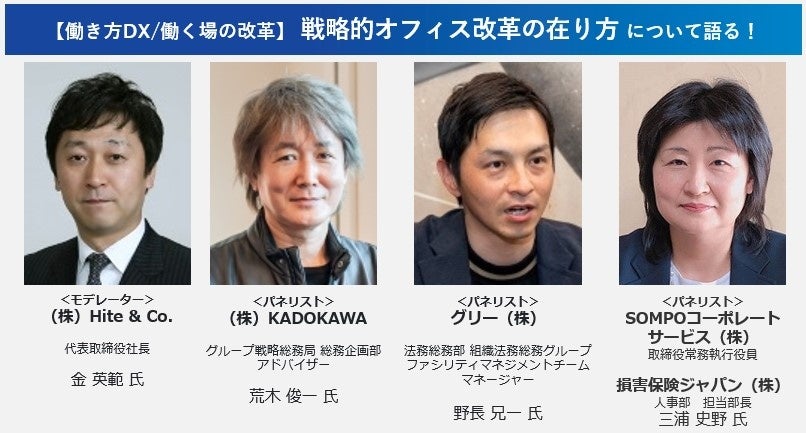 多数申込みが入っている「働き方DX/働く場の改革」セッションでは、昨今のテクノロジーの進化と働き方の多様化に沿った「自分達らしいオフィス」の再構築へチャレンジする企業にフォーカスをあてた内容になっています。正解はない中でのオフィス戦略と経営へ貢献、社員のハピネス、生産性向上へ影響力を出すにはどうしたらよいか。パネリストにKADOKAWA、グリー、損害保険ジャパンの3社を迎え、注目される3つの「攻めている」事例をベースにディスカッションを行います。