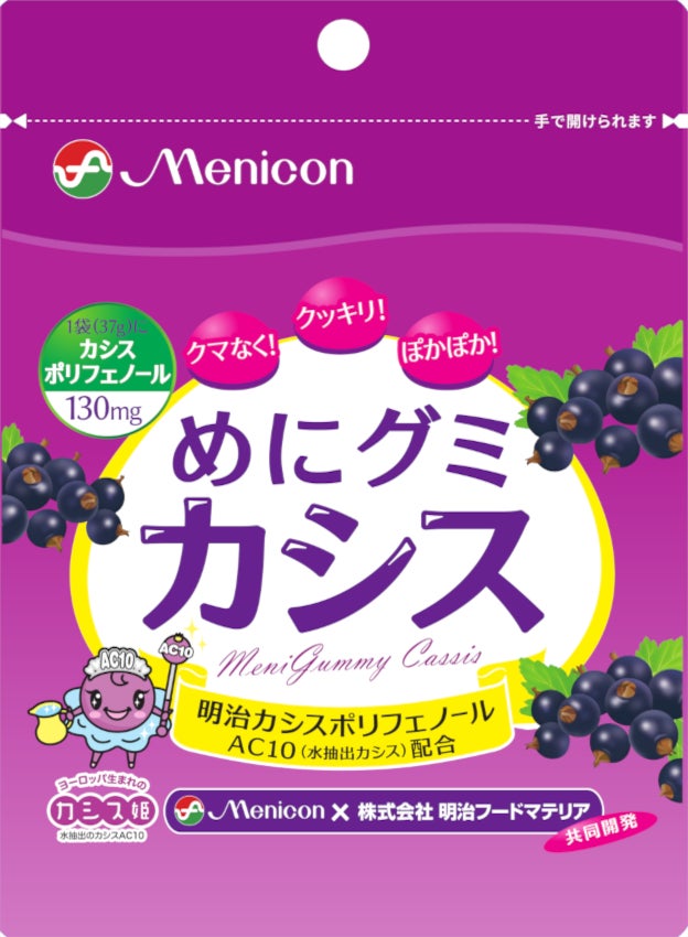 「めにグミ カシス」は、株式会社明治のグループ企業である株式会社明治フードマテリアとの共同開発により誕生した、カシスポリフェノールを1袋あたり130mg含むグミキャンディです。「めにグミ カシス」に配合されている「明治カシスポリフェノール(AC10)」※は、欧州産のカシス果実から水で抽出・精製したポリフェノールで、天然果実の美味しさをそのままに、健康への働きが期待されるカシスポリフェノールを高濃度に含んでいます。