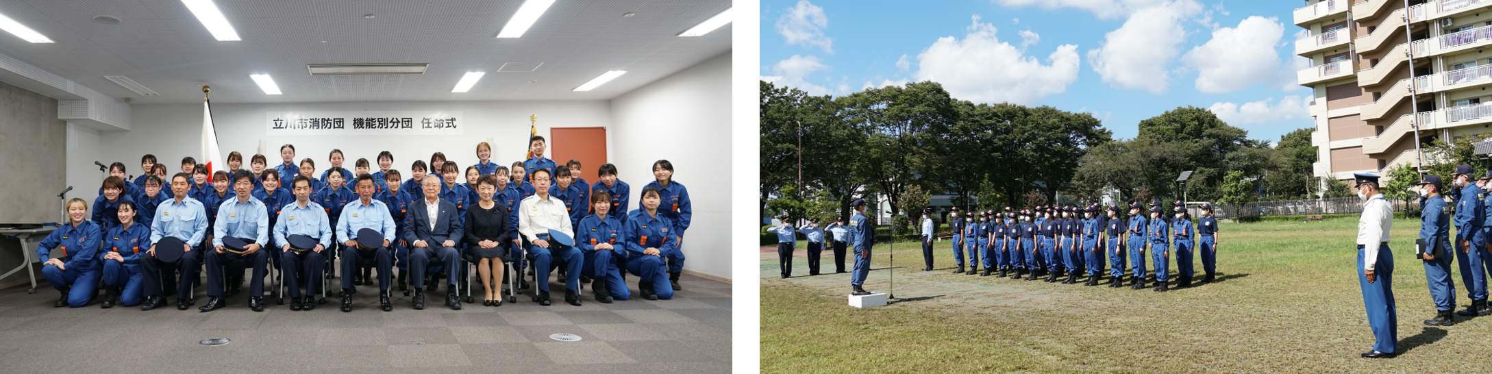 同年10月に発足した「立川市消防団 機能別分団(学生消防団)」は大規模災害時に消防団本部直轄の団員として、災害現場・大学施設での救命活動を行うほか、大規模災害に備えた訓練および主要行事への参加、自治会・学校などに対する応急救護訓練指導などを行います。4年目となる本年は、本学から1年次生40名の学生が新たに入団し、2年次生、3年次生、4年次生と合わせ合計150名となり立川市消防団員の5割以上を占めることになりました。