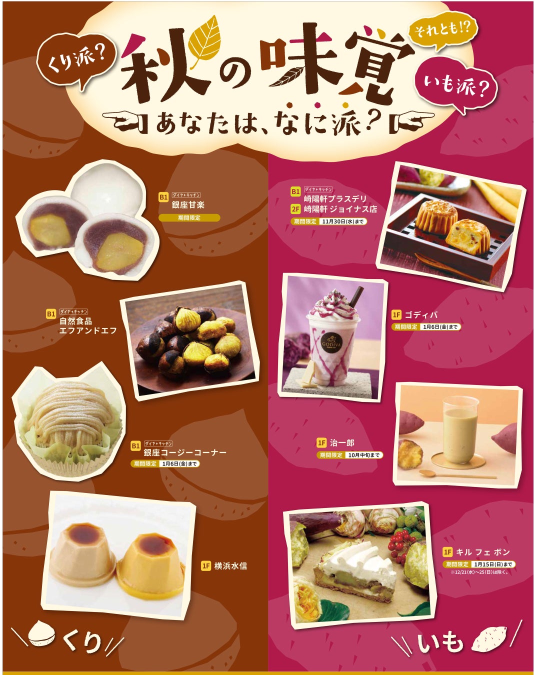 ジョイナスでは秋の味覚である、「くり」・「いも」を使用したスイーツや実りの秋の旬のグルメを豊富にご用意しています。