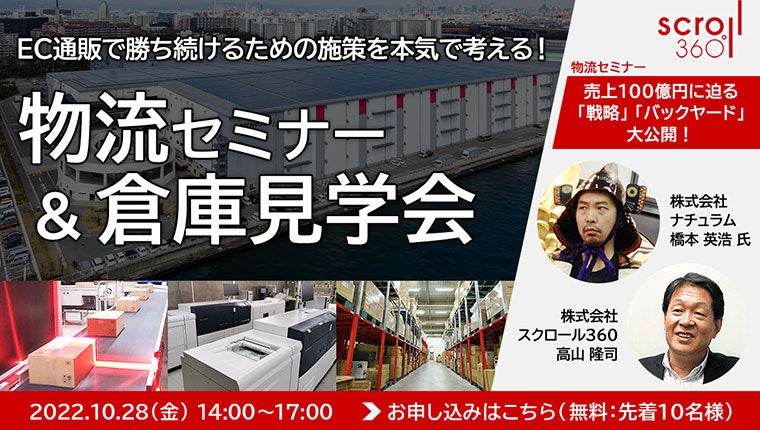 当日は株式会社ナチュラム 橋本氏による売上UPセミナーも同時開催。物流支援事業者様100社以上を誇るスクロール360の物流現場を、実際にご覧いただきながら学べるビッグチャンスです!