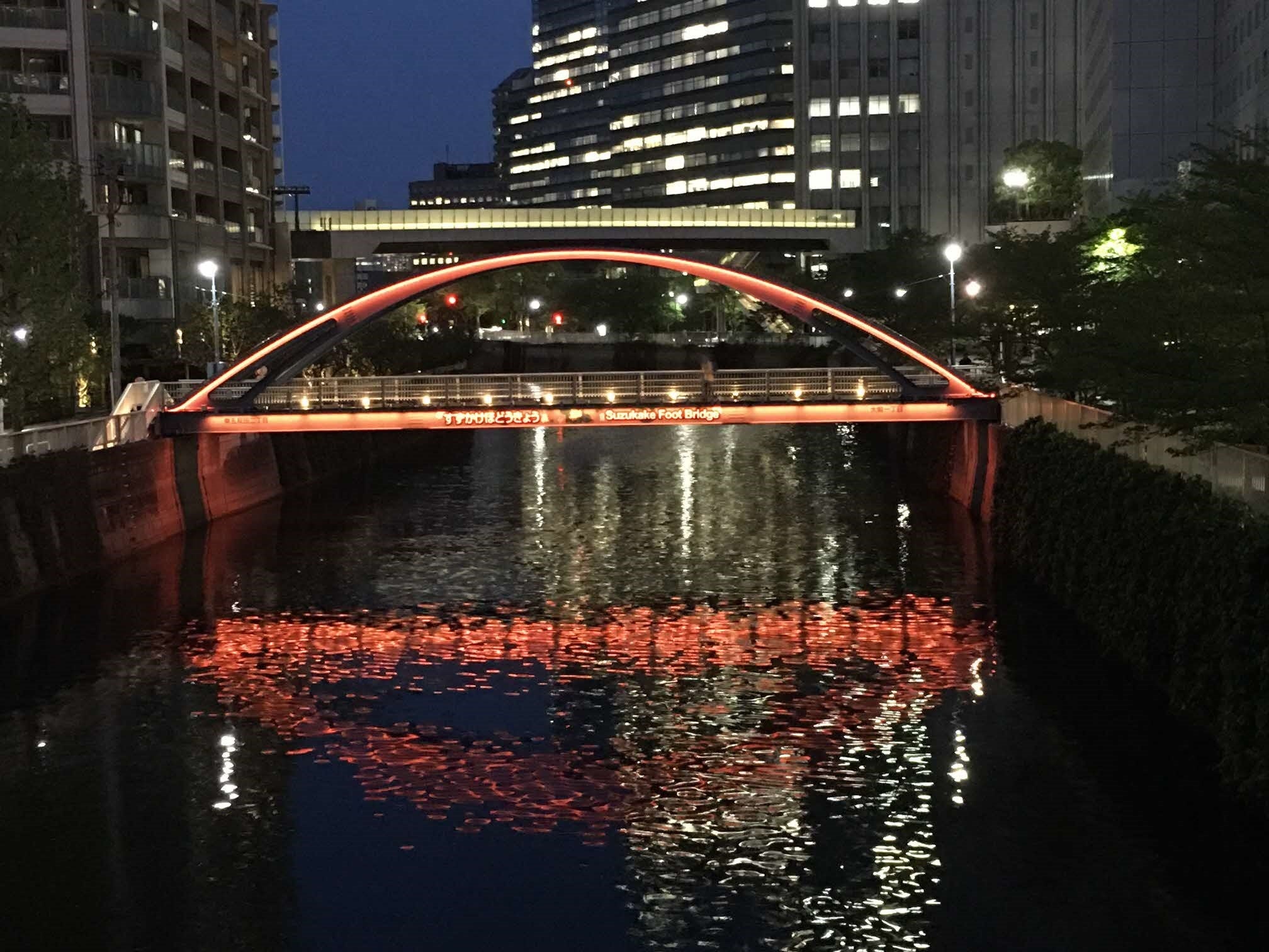 季節をイメージしライトアップされた鈴懸歩道橋