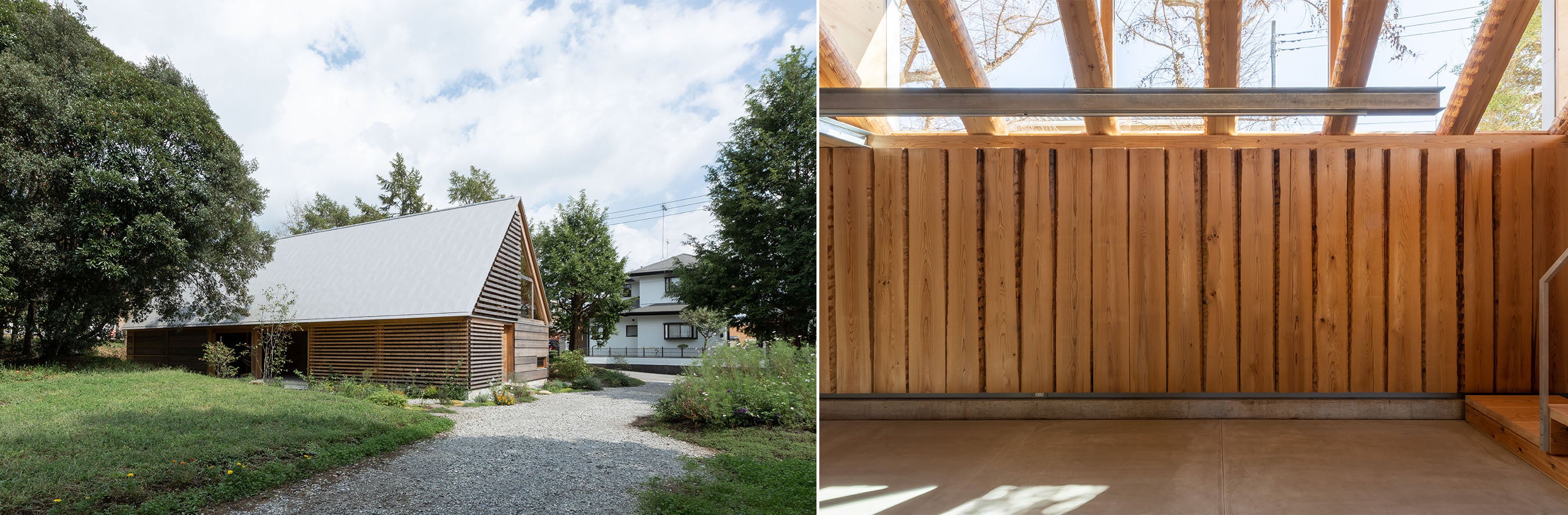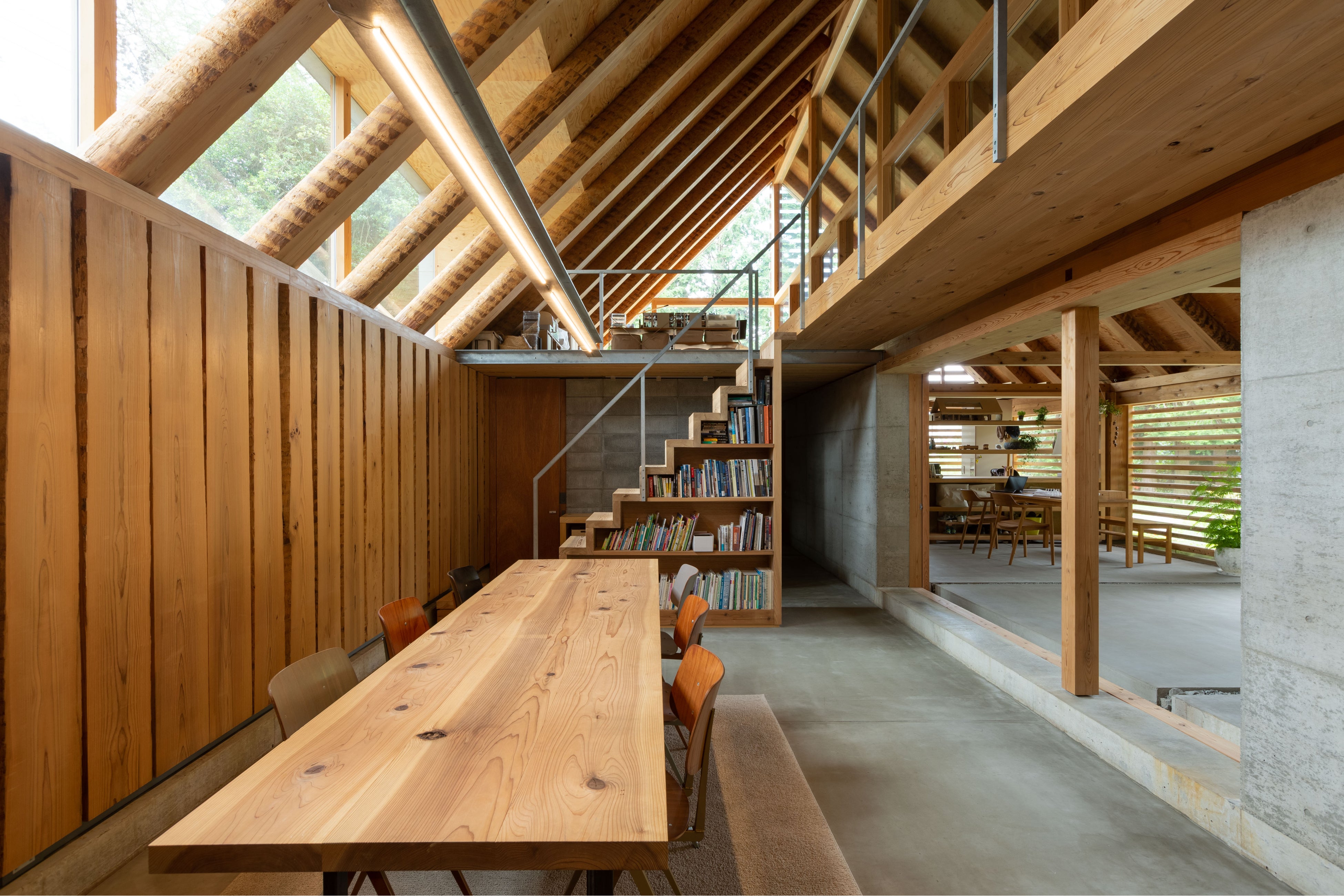木造住宅の流通、加工という大きなテーマに挑んだ意欲作。現代においてほとんどの木造住宅の木材は、製材済みの流通材を、プレカットという工場加工をした上で建設現場に納入しているが、その過程で材料の歩留まりは45%にとどまり、林業従事者の収益も減ってしまうのだという。この問題に切り込む本作は、国産の大径材をそのまま活用する工法により、歩留まりを80%にまで上げているだけでなく、解体後も再生可能な木材として活用できるよう、接合部にまで詳細な設計を施している。これらの試みから生まれた家は、まさに木材にそのまま包み込まれるような体感を与えており、プロジェクトのヴィジョン・実現するためのアイデア・実際の空間、その全てに高い評価が寄せられた。