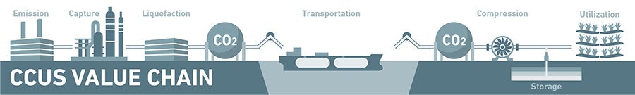 CO2を回収して転換利用や貯留を行うCCUSは、カーボンニュートラル社会を実現するための有効な手段として注目されています。CO2の排出地と貯留地・活用地は離れていることが多いことから、CO2を安全かつ低コストで輸送する手段としてLCO2船は将来的な需要の拡大が期待されています。三菱造船は、本船の建造経験を生かし、当社グループが戦略的に取り組むエナジートランジションの事業強化につなげるとともに、CCUSバリューチェーン構築に必要なLCO2船に関する各種技術を開発していきます。