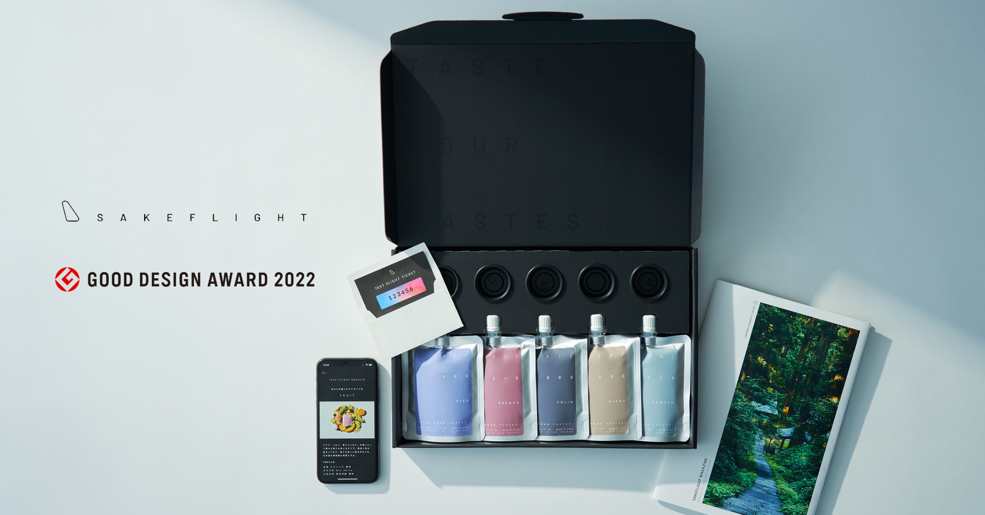 SAKEFLIGHT(サケフライト)とは、スマホアプリであなたの ”サケタイプ” を診断し、パーソナライズされた日本全国の地酒が届く日本酒の定期便です。若者の日本酒離れが進んでいると言われているなかで、「日本酒をもう一度、国民的お酒に。」という思いを込めて、一人ひとりが好きな風味を知ることができるサケタイプ診断と毎月異なるエリアの地酒と特産物のペアリングを楽しめる、日本酒ビギナーの方でも日本酒を美味しく始めて、楽しく続けられる体験をデザインしました。