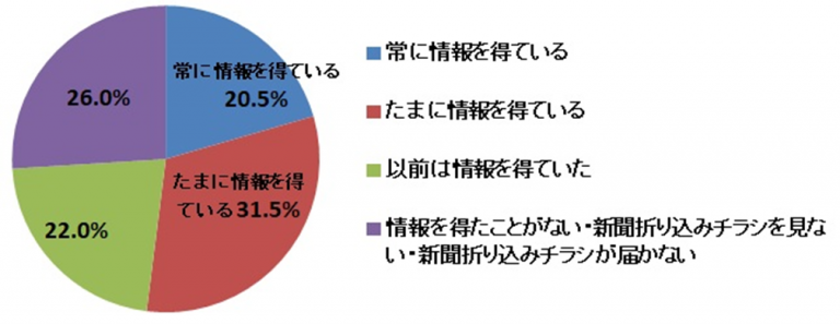新聞折り込みチラシから「常に情報を得ている」人と「たまに得ている」人を合わせると、回答者の52%がチラシを情報源にしていることがわかります。