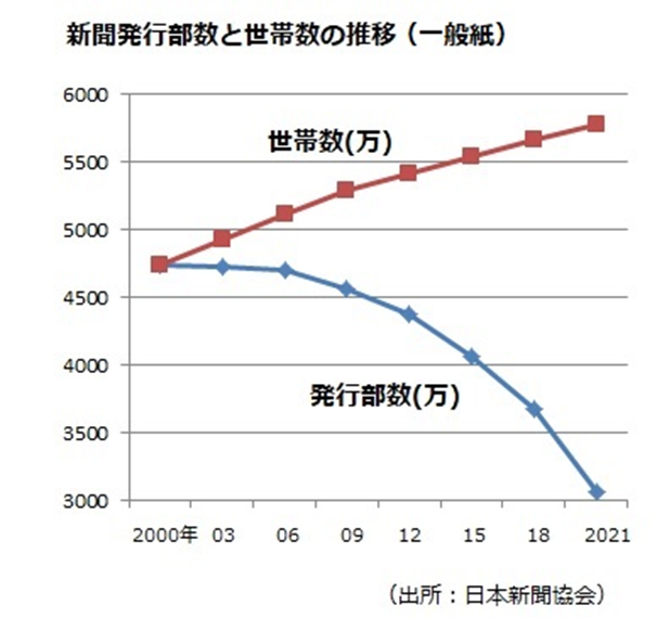 折り込み広告費の減少の主な理由は、新聞の発行部数が年々減っていることにあります。日本新聞協会によると、一般紙の発行部数は2000年の4740万部から、2021年には3065万部へと約35%減っています。この間、核家族化が進んで世帯数は増えているのですが、新聞を定期購読しない家庭が増えていることを示しています。