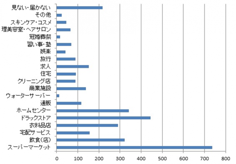 どんな分野の新聞折り込みチラシを見て利用しているかを複数回答可で質問したところ、「スーパーマーケット」が700人を超え突出していました。次いで「ドラッグストア」が400人超、「ホームセンター」と「飲食店」が300人超と、上位を占めました。