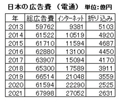 - 日本の広告費、インターネット関連が伸び、新聞折り込みは半減