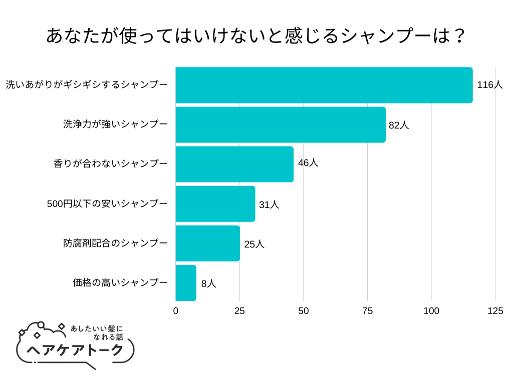 「あなたが使ってはいけないと感じるシャンプーは?」とアンケート調査した結果、1位は『洗いあがりがギシギシするシャンプー』でした。
