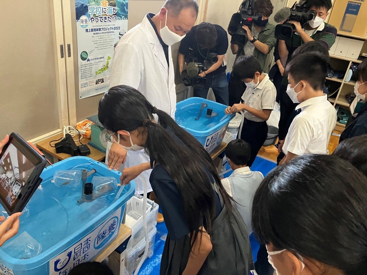 ヒラメ専用の水槽の設置から少しの期間を空けて、いよいよヒラメを受け入れる日がやってきました。それぞれの学校で、NPO養殖振興会代表理事の斉藤先生がヒラメの育て方や注意点についてお話をされ、児童たちは改めて命を育てる・預かるということについて気を引き締めているようでした。