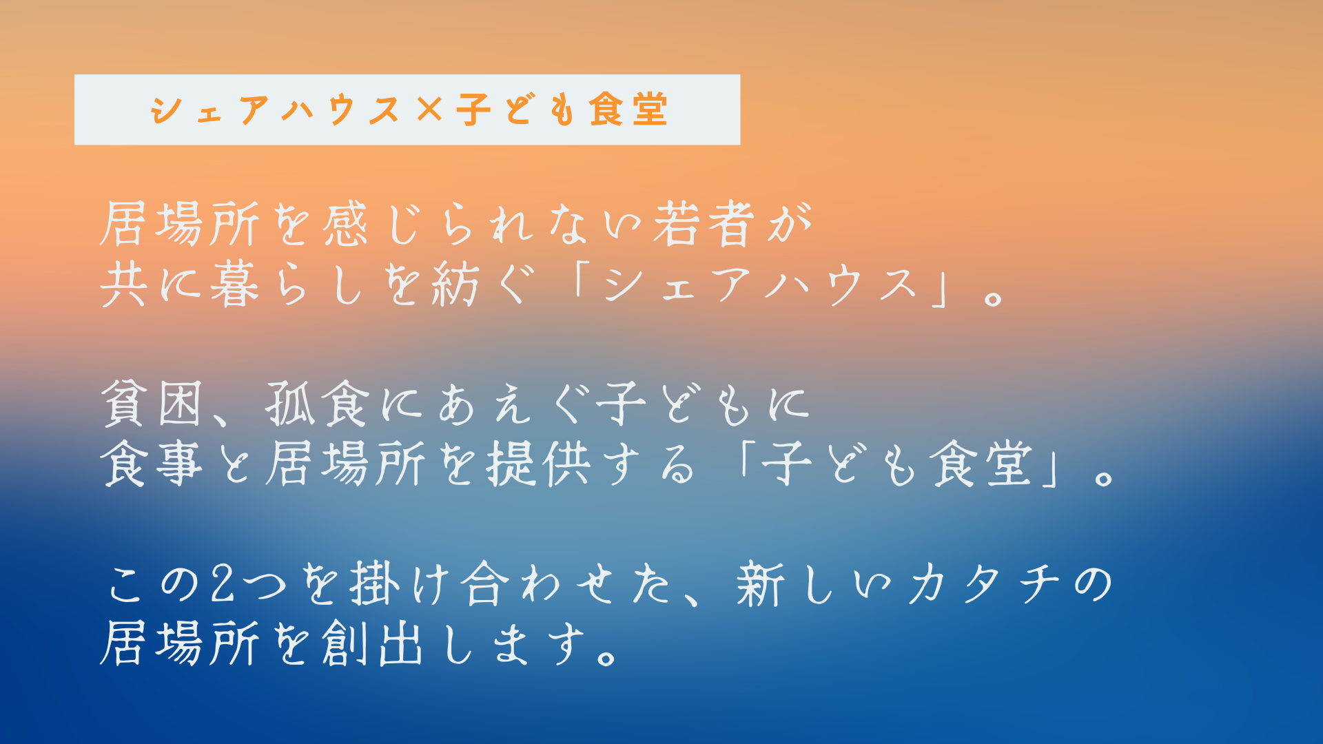 これらの課題を解消すべく、「空き家を活用」し、「若者が心地よく共同生活を送れる」環境を用意し、「気軽に立ち寄れる子ども食堂」を併設した空間の創造に取り組みます。