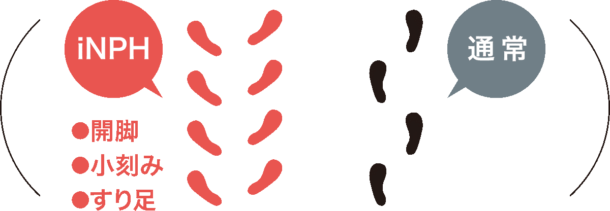 特に、iNPHの最も特徴的で、初期に現われやすい症状は歩行障害です。小股でよちよち歩く、少し足が開き気味で歩く、ひざが上がらずにすり足で歩く、などの歩き方は認知症が現れる他の病気と区別するポイントにもなります。また、症状が進むと、歩行が不安定でバランスが悪くなり、1歩目が踏み出しづらくなるため、転倒の大きな原因になることもあります。『特発性正常圧水頭症ガイドライン診療第3版』によると、バランス障害、姿勢反射障害、不安定性、椅子から立ち上がることが困難になる、突進歩行などにより、日常生活動作でふらついて転倒しやすく、転倒歴を聴取することが望ましいとされています。また、2020年5月~10月に実施した調査データによると、期間中に来院し頭部CTを施行した60~89歳の転倒患者は235人、うち40%の方々がiNPHの罹患者であったことが明らかになっていることからも、iNPHがいかに転びやすい病気であり、iNPHの早期発見が転倒予防に重要であるということが分かります(※2)。
