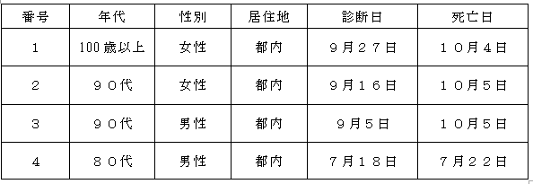 新型コロナウイルスに関連した患者の死亡について business Twitter Facebook はてブ Pocket LINE コピー 2022.10.10 この記事は約1分で読めます。 都内で新型コロナウイルスに感染した方が死亡されましたのでお知らせします。 お亡くなりになった方のご冥福をお祈り申し上げます。 ※ 患者・御家族の人権尊重・個人情報保護に御理解と御配慮をお願いします。