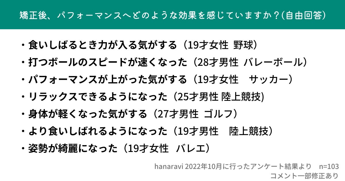 今回の弊社による調査では、アスリートの実感を通しての主観的なリサーチでしたが、歯科矯正を行われた方々が主観的に効果を感じられているという結果については示すことができたという結果となりました。