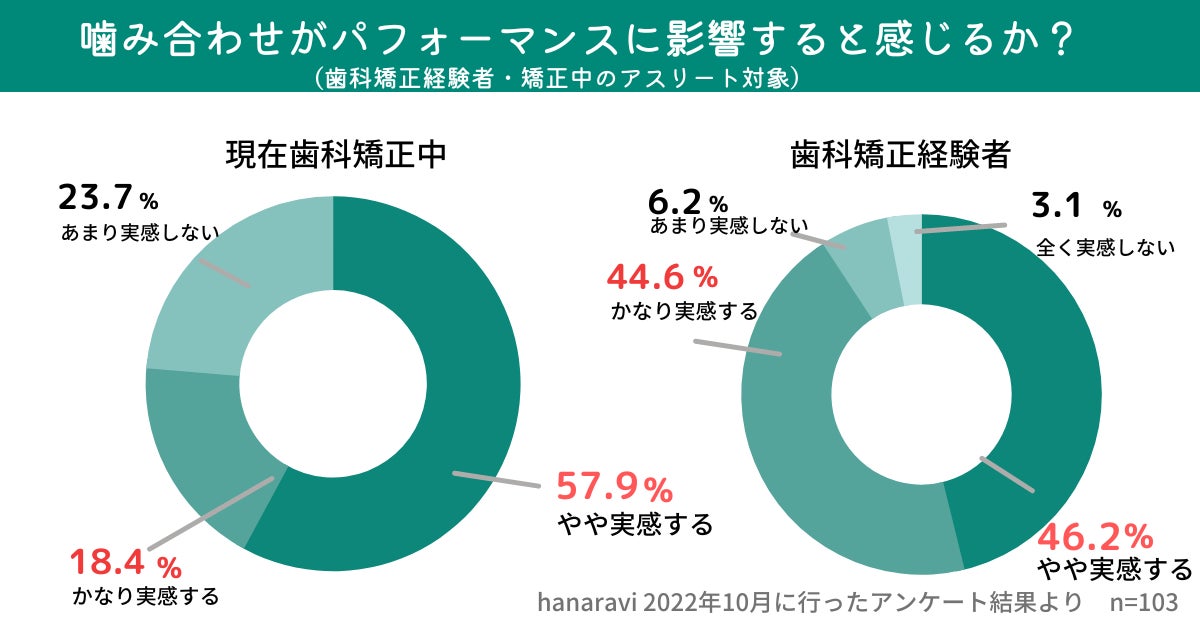 「歯科矯正経験者(n=103)に対し、「競技パフォーマンスに噛み合わせが影響すると感じますか??」という質問を行なったところ、現在矯正中の回答者の76.3%、過去歯科矯正を行なった回答者では90.8%がパフォーマンスへの影響を実感していると回答しました。歯科矯正の途中の方より、すでに歯科矯正を終えられた方のほうが実感されているという結果になりました。