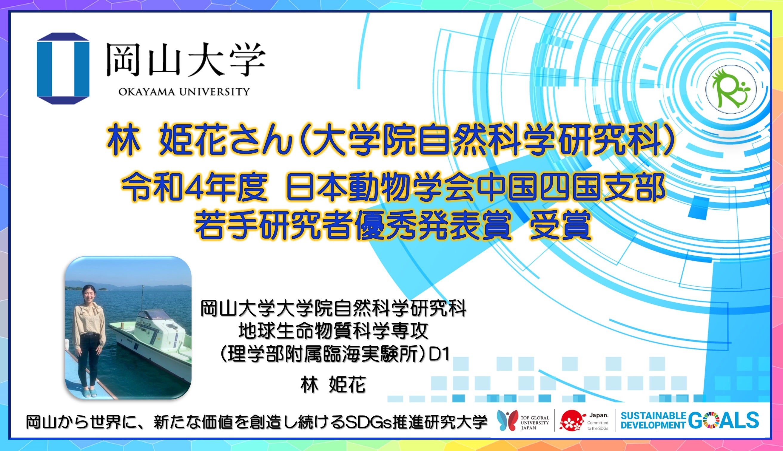 2022年5月21日(土)~22日(日)に島根大学が主幹となってweb開催された生物系三学会中国四国支部大会(第73回動物学会支部大会・島根大会)において、岡山大学大学院自然科学研究科地球生命物質科学専攻(理学部附属臨海実験所)の林 姫花(はやし ひめか)大学院生が「日本動物学会中国四国支部会若手研究者優秀発表賞」を受賞しました。