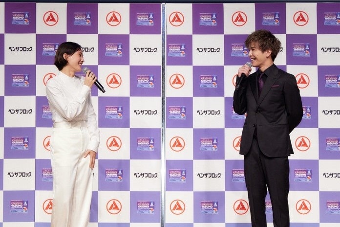 イベントには新CMに出演する綾瀬はるかさんと岩田剛典さんが登壇。綾瀬さんは2011年にベンザブロックのCMに出演して以来今年で11年目、一方で岩田さんは今回がベンザブロックのCM初出演となります。CMの見所では、ベンザブロックプレミアム「プレミアムエクスプレス篇」で駅長役をつとめた綾瀬さんは、「駅長の衣装と、駅長らしいセリフにぜひ注目してください。」、ベンザブロック YASUMO「羊の執事篇」の羊の執事役の岩田さんは、「羊のツノがちょっとした角度で映りが変わってくるので、ツノをつけるためのヘアメイクが大変でした。CMでは、“ぐっすり休もう、ぐっすり治そう、ベンザブロック”のサウンドロゴを歌えたことがとても光栄でした。」と話しました。
